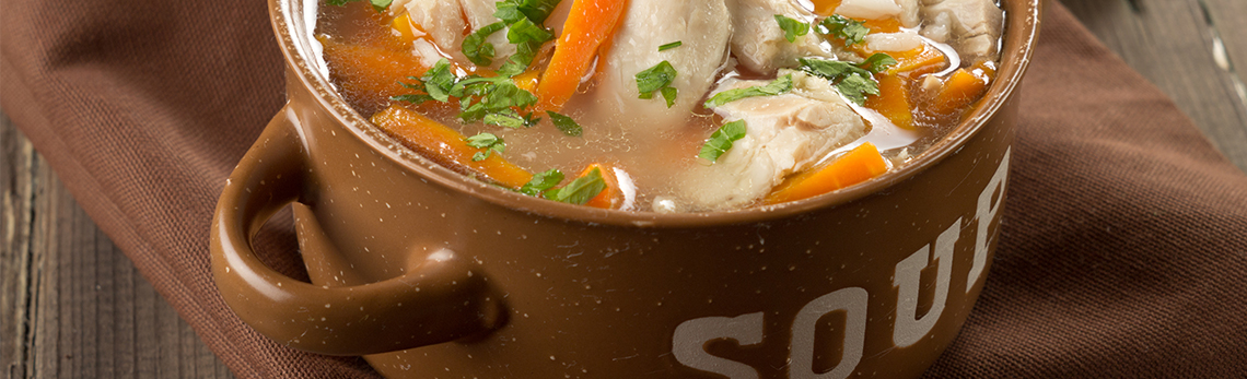 Remove the chicken from the pan and strain the broth. Save the veg for later. Put the broth back on a high heat and allow to reduce for 15 minutes until there’s about 2 litres left.